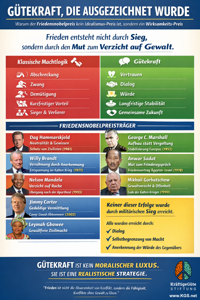 Unsere Stiftung ist parteiisch, wir betonen die Aspekte großer Ereignisse, die Gütekraft-Erfolge zeigen. Dabei ist uns klar, dass Gütekraft oft auch deshalb eingesetzt wird, weil man andere Mittel nicht hat oder weil man auch an eigenen Gewinn denkt. Beides ist kein Argument dagegen, wie enorm wirkungsvoll Gütekraft sein kann, wenn man sie überzeugt anwendet. Denn Gütekraft ist nicht "Verhandlungsgeschick" sondern ehrliches Bemühen, alle Seiten zu sehen und eine Lösung zu finden: