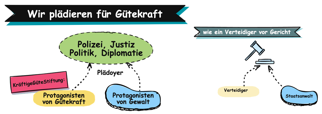Diesen Gedanken bei Polizei, Justiz, Politik und Diplomatie zu verbreiten ist Aufgabe der KräftigeGüteStiftung. Denn Entscheidungsträger werden nur gütig handeln, wenn Sie davon überzeugt sind - Ihre Überzeugung stellt die Weiche, ob eine Situation gütekräftig oder mit Gewalt gelöst wird: